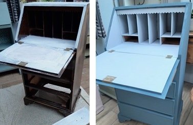 This bureau was very old and needed to be primed before painting. It was then painted in two contrasting colours and the inside and outside was finished in clear wax. A little black wax was applied to the outside to age it a little plus add interest and depth. A day later it was buffed to a soft sheen with a dry cloth. A discarded unwanted desk is now perfect for home working.